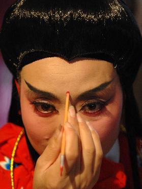 9月20日,戏班成员沈红雨在化装准备登台演出。