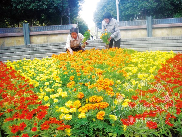 为美化市区环境,迎接国庆佳节的到来,连日来,园林工人正加班加点,在市区主要广场、剡园、鹿山公园、嵊州大桥及主要街道上种植、摆放万寿菊、一串红、矮牵牛、孔雀草等鲜花,把剡城打扮得花团锦簇。记者从市园林管理处了解到,这次种植、摆放的鲜花共计7万盆(枝)。图为园林工人正在文化广场花坛上栽种鲜花。