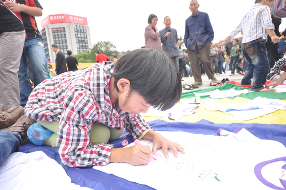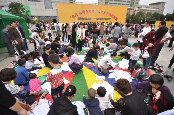 广场的地面上铺了很大的两块画布,一块用于孩子们自由涂鸦,一块用来在文化衫上涂鸦。上百名孩子纷纷拿起画笔,画出自己喜爱的图像,爸爸妈妈们也在旁边细心的指导,有的还叫了爷爷奶奶来助阵。
