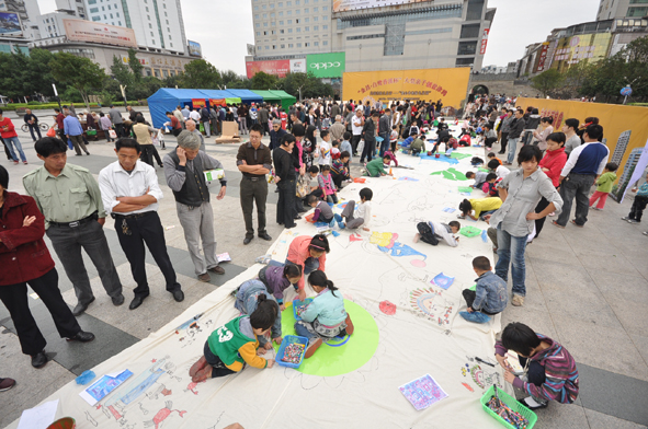 今天上午,由新闻传媒爱心公社和城隍坊社区主办,金昌房地产公司协办的以“共创生态市——我心中的绿色家园”为主题的大型亲子创意涂鸦活动在文化广场拉开帷幕,孩子们用手中的画笔,描绘和展示缤纷亮丽的孩童世界,以此迎接新中国成立62周年。