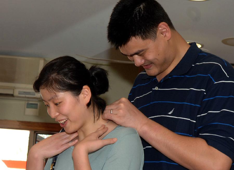 10月1日,姚明(右)在为夫人叶莉戴上为她新购买的项链。当日,姚明利用在澳大利亚西澳州布鲁姆市出席凯布尔沙滩篮球邀请赛的机会偕夫人叶莉到布鲁姆市郊区休闲购物,姚明这次是以上海大鲨鱼篮球俱乐部老板的身份率队前来澳大利亚参加凯布尔沙滩篮球邀请赛。新华社记者江亚平摄