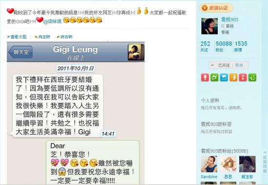 同时芸妮也在微博中表达了自己激动的心情,并且送上了自己的祝福:“刚收到了今年最令我激动的讯息!!!!我的好友阿芝!!!你真成!!!大家都一起祝福敢爱的GiGi吧!!!!@梁咏琪。”