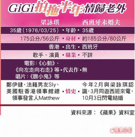 据香港媒体报道,35岁的梁咏琪(GiGi)即将于下周一(10月3日)嫁给相恋半年的西班牙男友,结婚地点将在西班牙伊比萨岛举行。9月30日她开心地承认并称赞未婚夫:“Thank you(谢谢),他真的很好很好,我很感恩。”与她曾有7年情的郑伊健昨天(9月30日)也大方地向她表示祝贺:“衷心祝福她,祝她幸福快乐。”她在刚过去的星期二(9月27日)与家人前往西班牙与亲家见面及筹备婚礼,9月30日她已在当地试穿婚纱。