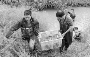 今年嵊州市水产总养殖面积达25380亩,确立了甲鱼、鳟鱼、南美白对虾等多种特色水产,改变了养殖结构,丰富了市民的菜篮子。图为昨日养殖户正在收获南美白对虾。【来源:天天商报】