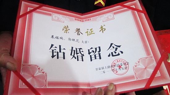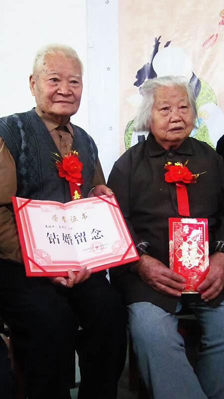 “我们结婚69年了,从来没有吵过架!”10月5日上午,91岁的陆喜岳老人拉着同岁的老伴冯杏芬乐呵呵地说道。当日,甘霖镇上路西村欢度重阳钻石婚庆典活动在村老年协会活动室举行,近500位老人见证了村里13对钻石婚夫妻相濡以沫的爱与亲情。 据了解,甘霖镇上路西村共有1960多人口。其中有13对钻石婚老夫妻,年龄最大的为91岁,最小的为80岁。庆典活动的开展在为全村老年人庆祝节日的同时,也为向“半世纪牵手终不悔,六十年同心永相随”的钻石婚夫妇致敬。 参加庆典活动的13对钻石婚老人大都白发苍苍,但是幸福的笑容始终挂在彼此脸上。83岁的裘露乡老人与妻子张月珍结发于今66年。一路走来,两人互敬互爱、相互扶持。作为钻石婚夫妻的发言代表,做了一辈子教师的裘露乡激动地始终停不下话匣子。“年轻的时候我什么病都有,能活到这把年纪已经非常幸运。现在家庭和睦、子女孝顺,两个人身子骨越来越好,都不用上医院了。这些都是以前想都不敢想的!”结识在战争年代的他们,更让彼此学会了珍惜对方,互相礼让,共同创造了美好的家庭生活。漫漫风雨路,他们对爱情的执着,对彼此的宽容,才迎来了今天的夕阳红。 庆典现场,民政局领导为钻石婚夫妻颁发了《荣誉证书》及奖金。同时为村里所有老人赠送了纪念品。