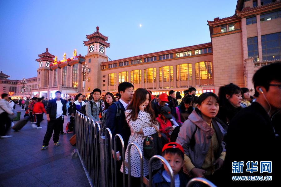 10月6日,从北京火车站出站的旅客排队进入地铁站。国庆长假即将结束,航空、铁路、公路客运人数大幅增加,各地迎来返程客流高峰。 新华社发(李文明 摄)