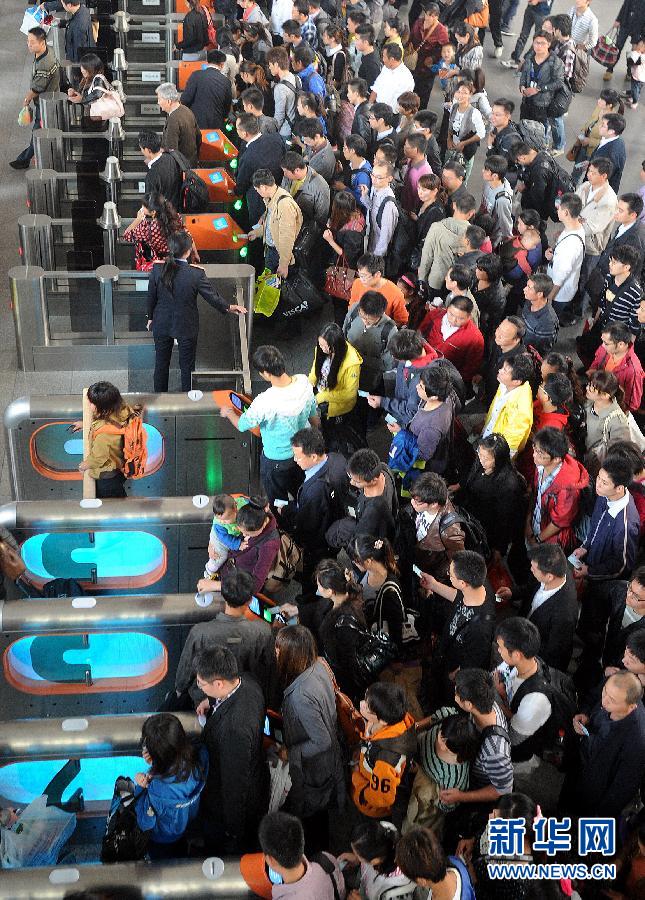 10月6日,旅客在苏州火车站检票进站。国庆长假即将结束,航空、铁路、公路客运人数大幅增加,各地迎来返程客流高峰。 新华社发(杭兴微 摄)