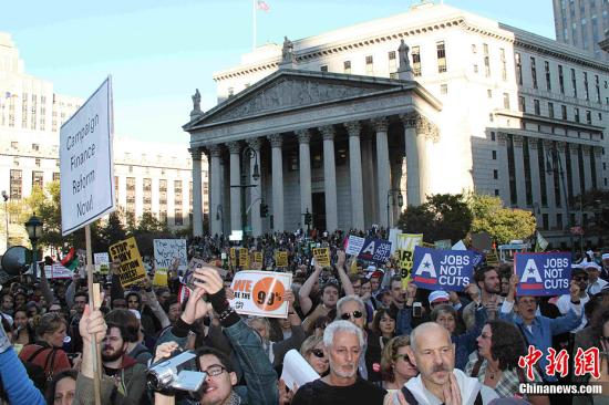 从9月17日起,纽约爆发了一场名为“占领华尔街”的民众抗议活动,并一直持续至今。目前抗议浪潮已向洛杉矶、波士顿、芝加哥、华盛顿等美国50多个大城市蔓延。抗议活动的矛头主要指向华尔街“贪婪”、金融系统弊病和政府监管不力,以及高失业率等社会问题。(记者 吴庆才)