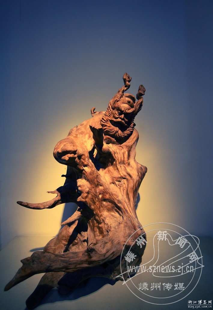 于是,本来就文化底蕴深厚的嵊州,自发形成了一批根雕艺术家。多看几个根雕作品,就能发现好的根雕艺术品,充分利用原木根部或古沉木的本身形状,只消数刀就赋予朽木生命,如《天问》,利用白蚁竖向蛀纹路,将仰头问天的屈原拉长干瘦的颈部充分展现,一个忧国忧民的先知形象立即定格在人们面前。
