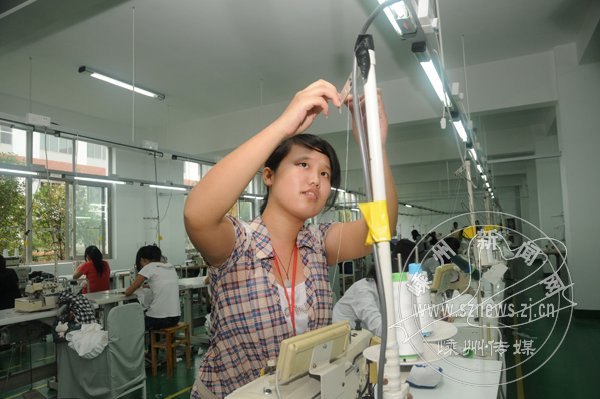 职教中心服装专业实训基地有服装实训室25个,有高速平车室、打样室、裁剪室、服装CAD室等,拥有近900万元的实训设备,今年6月申报成为国家级实训基地。图为职教中心服装专业学生正在实训室培训。