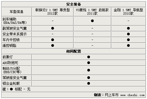 三车主动安全方面ABS+EBD和被动方面的主驾驶席安全气囊成为了三车的共同装备,铝合金轮毂和前雾灯也成为了三者的标配。V3菱悦的刹车辅助与另外两车的副驾安全气囊各有侧重,但车内中控锁和遥控钥匙则成为了另外两车型的安全与实用的兼得装备(虽然这两项汽配市场几百元就能解决,但动了大线的拆卸有些不妥),其中金刚的唯独配备的安全带未系提示作用非同一般。