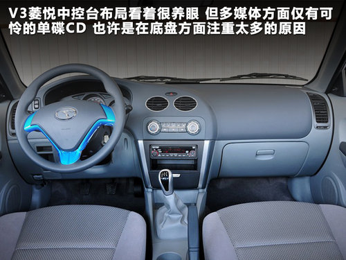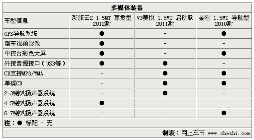 多媒体信息方面,运动性能较好的V3菱悦配置同样不是很给力,单碟CD、两个扬声器、外接音源接口等几样而已。另外其他另外两车还具有时下流行的集成GPS导航功能的中控液晶彩色大屏,到新旗云2液晶彩色大屏还兼具有倒车影像功能,这项实用功能对于新手尤为有利。但金刚还有单碟CD娱乐可供选择,这样的多装的配备何乐而不为呢?