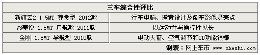 总结:通过这几项的对比,三款车型配置及卖点可谓各有侧重点,安全性各有特色;运动性方面三车中非菱悦V3莫 属;而在车身舒适性方面,新旗云2的行车电脑作用很突出,而金刚的电动天窗及空气调节同样给力;影音娱乐方面,新旗云2液晶大屏还集成了倒车影像显示,而 金刚则多出单碟CD供娱乐。而至于外观的方面的喜好?那显然是萝卜白菜各有所爱了......