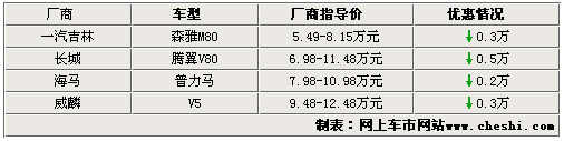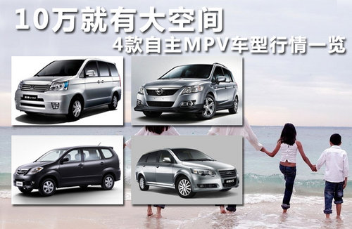 今天为您精选的4款自主品牌的MPV车型,厂商指导价均在5-13万元之间,近期优惠情况最高降幅5000元。这四款车中,一汽吉林森雅M80售价最为便宜,拥有SUV般的通过性,还兼顾了家用轿车的舒适感受;长城腾翼V80轴距最长,达到2825mm,与4574/1704/1845mm长宽高巧妙组合,无论腿部、头部还是腰部均能获得理想的空间,放倒后两排座椅后的后备箱容积已达惊人的2000L;海马普力马外观最时尚,新款普力马经过重新设计后,外形更加动感。一改商用面貌的他,融入了更多家用的味道;威麟V5最实用,内部有多达28处储物格,并且第三排座椅放倒后的室内空间已达1342L,灵活多变的空间组合无论商务接待还是周末郊游均能胜任。
