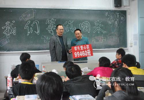 今年8月,嵊州二中高二(5)班张锦城同学被诊断出患上急性白血病并接受了化疗,在不到半个月的时间里,他由原先的120斤体重骤减到仅70斤。与此同时,一个疗程未完就已经花费了20多万元的巨额医疗费用,让家庭收入微薄的张锦城父母根本无法承担。得知因患白血病需要巨额医疗费用的消息后,嵊州二中领导极其重视,迅速向全体师生发出捐款倡议书。一时间,广大师生都投入到这场爱心活动中,纷纷伸出援助之手,在短短三天时间里,共获得师生捐款154515.2元,其中高二(10)班的周健生同学和高二(11)班的黄晔俊同学分别捐了一万元。高二(5)班同学更是在10月2日上午放弃国庆放假休息,在嵊州市文化广场向社会人士募捐,共获得好心人的捐款24296.7元。截止10月12日,学校共获校内外爱心捐款178811.9元。目前,这些凝聚着师生情谊和社会人士爱心的善款已全部送到张锦城同学的父母手中。
