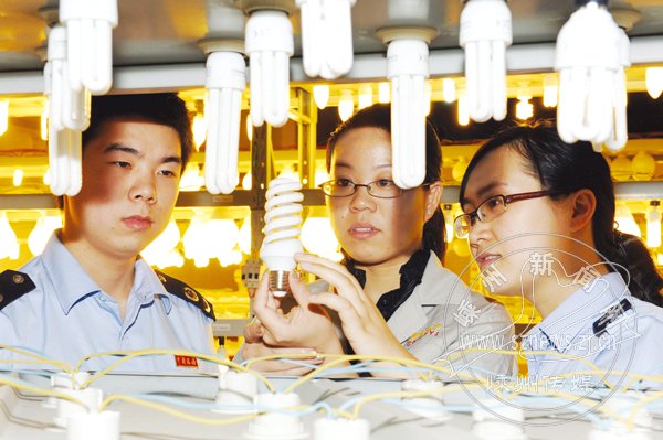 位于经济开发区的晨怡(浙江)电子实业有限公司,每月向欧洲、中东一些国家和地区出口高效节能灯达200万只。图为昨日该公司员工在测试车间向前来了解节能灯出口情况的国税局工作人员作介绍。