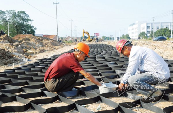 雅戈尔大道是市重点工程,全长2.23公里,主车道为16米双向四车道。目前,大道管道铺设已完成,路基工程开始上马,目前的进度已完成总工程量的40%,预计到年底可完成一半路面的浇筑。图为昨日施工人员正在铺设加固路基用的土工格栅。