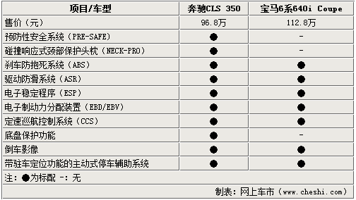在安全对比方面,从列表来看,奔驰CLS 350要比宝马6系在安全方面做得更好一些,此次发布的全新CLS在安全配置方面的一大亮点就是带驻车定位功能的主动式停车辅助系统,您只需按下一个按钮,汽车就能自动寻找合适的停车位并且自动进行驻车。一旦汽车检测到一个停车的区域,您就可以刮伤倒档确认您想要停车。接下来车就会按照系统指示停入指定位置,可算是非常人性化啊!