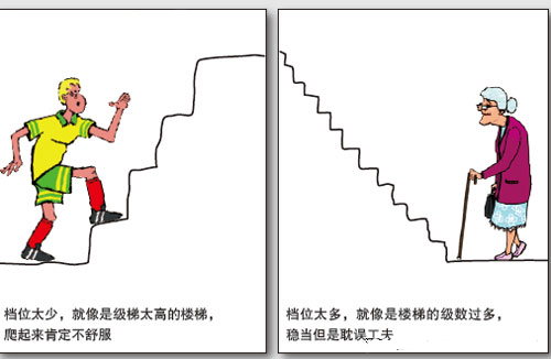 为了讲清楚这个问题,不妨让我们在生活中寻找答案。换档其实就好比是咱们上楼走楼梯,对应于存在一定高度差的楼梯,应该有合适数目的梯级,如果级数太少的话,每一个阶梯的高度就会太高,人只能迈开大步往上走,甚至是玩上跳,这种走法肯定不舒服,但是级数过多就一定好吗?都是迈不开步的小阶梯,让你像小脚老太太那样逐级挪着小碎步,还不如两级并成一步这样走起来痛快,是不是这个道理?