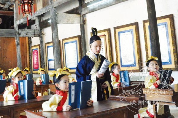 为保护深厚的文化资源,贵门乡政府投资近200万元于去年重修鹿门书院,这里成为乡土文化博物馆、贵门乡的综合文化站,也吸引了众多游人前来参观。近日一群五爱幼儿园的小朋友在贵门游览名胜古迹之际,穿上古色古香的服装,在鹿门书院感受800多年前的读书环境,开展了一次别开生面的诵读经典活动(如图)。