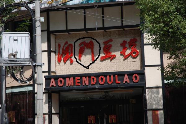 这位年轻母亲反映的商家是位于北直街剡城路口的澳门豆捞,该商家把“门”写成了繁体字“門”,难怪小孩子看不懂了。
