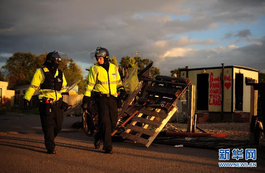 10月19日,两名防暴警察在英国巴西尔登附近的戴尔农场内巡逻。英国警方19日开始清理国内最大的流浪者非法居住区“戴尔农场”。部分居住者及支持者与警方发生冲突。戴尔农场位于首都伦敦以东大约50公里,住着大约400名流浪者。戴尔农场“非法”争议自2001年开始,英国一家法院上周裁定予以清理。当地“居民”主要是爱尔兰流浪者,他们称清理行动针对弱势群体,侵犯他们的权利。新华社/法新