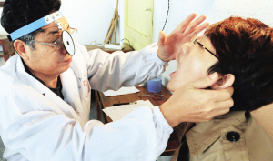 嵊州市卫生系统的五官科医生金行祥已连续在该市征兵办服务征兵体检20个年头,由于他工作认真负责,严格把关,成为该市30多位征兵体检医生中的“排头兵”。图为日前金行祥医生在体检的现场。【来源:绍兴日报】
