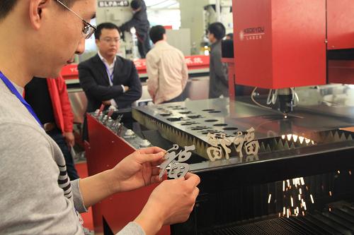 10月27日,参观者在嵊州举行的电机展览会上观看使用电脑激光切割设备切割出来的“福”字。当日,第四届中国(嵊州)电机展览会暨高新技术成果交易会在浙江省嵊州市举行。本次展览会以“搭建创新平台,推动转型升级”为主题,共设446个展位,吸引了国内多家企业、高等院校和科研机构前来洽谈交流。新华社发(金乐平 摄)