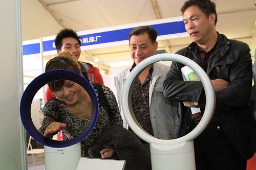 10月27日,参观者在嵊州举行的电机展览会上参观无叶电扇。新华社发(金乐平 摄)