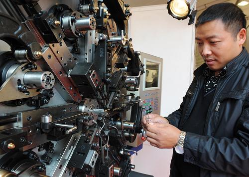 10月27日,一名参观者在嵊州举行的电机展览会上观看一款“万能弹簧机”。新华社发(金乐平 摄)
