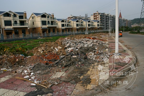 城西雅石路附近,建筑垃圾成堆,与周围新楼形成鲜明对比。