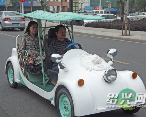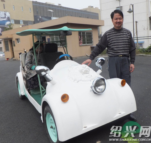 这位老人今年59岁,名叫袁樟生,退休前是嵊州一家泥塑厂的工艺美术师,平时喜欢钻研汽车。在此次车展上,他秀出了由他手工制作的一辆白色电动小汽车。这辆小汽车的动力来自5个电瓶,轮子是从货运三轮车上拆下来的,外壳、转向系统等零部件都由其自己打造的。电动小汽车一次充电后,可以连续行驶80公里,时速可达到30至40公里。