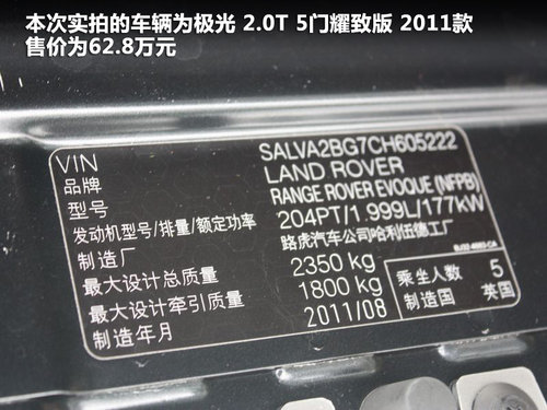 此次到店的极光车型为2011款2.0T 5门耀致版,预计售价为62.5万元,还将推出多种的颜色及诸多功能选配服务。极光作为路虎家族全新的一系,动感时尚的造型加上车载全路况越野利器可以游走于公路和山路之间。