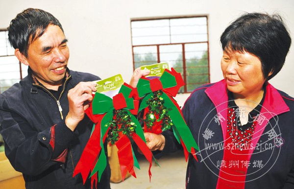 “喏,这就是要出口美国的圣诞蝴蝶结。”昨日,在崇仁镇范村的一个来料加工点,工人们正在整理今年最后一批出口的圣诞蝴蝶结。