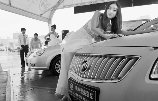 11月4日,虽然天下大雨,为期三天的2011嵊州车展在嵊州市体育馆揭幕,本次车展由嵊州市商务局等单位主办,车展吸引了宝骏汽车等新生品牌,也有上海大众、马自达等品牌280多款车在现场展出。这是车展现场车模在助兴促销。【来源:天天商报】