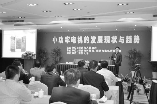 在日前举行的电机论坛上,浙江大学电气工程学院教授沈建新为嵊州市的电机企业经营者作了题为“科技引领,做有特色的电机产品”的报告。图为讲座现场。 (记者 张亮宗 摄)