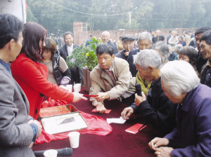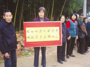 11月8日上午,远嫁日本的朱湘珍回到了家乡嵊州市长乐镇山贝村,她这次专程回家是受公公之托,来向家乡人民感恩的——感谢在今年“3·11”日本大地震时,家乡人民对她以及她的家人的关心。朱湘珍这次“感恩之旅”所携带的,除了给全村239名60岁以上老年人每人一个红包和一份生日蛋糕外,还有10万元公益资金。