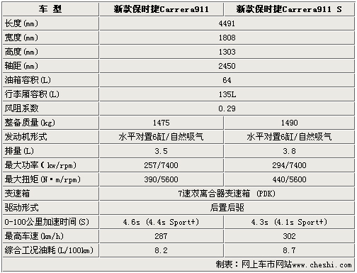 现在在保时捷的官方网站上已经可以看见两款全新Carrera911的部分信息与图片,这两款车型分别是入门级的Carrera911与性能更强劲些的Carrera911 S版。前者搭载水平对置6缸257kW发动机0-100 km/h加速用时:4.6s最高时速:287km/h。后者搭载的发动机输出功率更高些,达到了294 kW,0-100 km/h加速用时:4.3s最高时速:302 km/h。新款车型性能与老款车型相比略有提升。