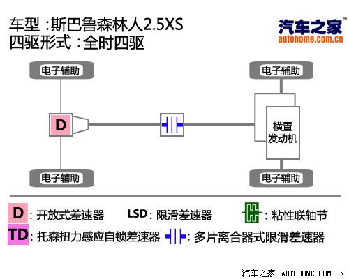 这套系统与途观、奇骏、欧蓝德等大多数SUV的工作原理相同:扭力由发动机传至变速箱,变速箱先把扭力传递给前轴,在输出到后轴之前先经过一个电控多片离合器式限滑差速器,最后传给后轴。前轴永远得到动力,后轴是否接通也就是否变成四驱是靠多片离合器的压紧和放松决定。这也是典型的全时四驱结构。斯巴鲁在其中加入了伞齿式机械中央差速器,让车辆在弯道也能行驶自如。
