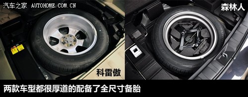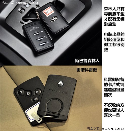 还有一些方面两者间有在着共同的优点,当然也会存在一定的差异。比如我们看到两款车型都厚道的配备了全尺寸备胎,50万的奥迪Q5和凯迪拉克SRX还没这个福分呢。两车的钥匙也有不小的区别,如果图面子我会选科雷傲,同样是无钥匙启动,科雷傲的卡片式档次感比森林人传统的款式更高些,但后者的电装产品做工质感更佳。