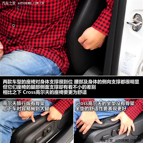 在乘坐感受上,两款车的座椅都还是很舒服的,对身体的支撑也都很到位。不同的是高尔夫旅行版的坐垫侧向支撑里面有骨架,虽然对腿部的支撑很有效,但上下车是大腿会被搁到,而Cross高尔夫的座椅内部则没有骨架,上下车时腿部要舒服了很多。