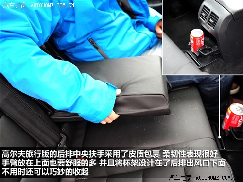 高尔夫旅行版的后排中央扶手采用了皮质包裹,柔软性很好,手臂放在上面也很舒服,杯架也被巧妙的设计在了后排出风口的下面。而Cross则采用了硬质塑料,舒适程度受到了一定的影响,并且由于没有后排出风口的空间放置杯架,所以杯架的设计也占用了一部分中央扶手的空间。