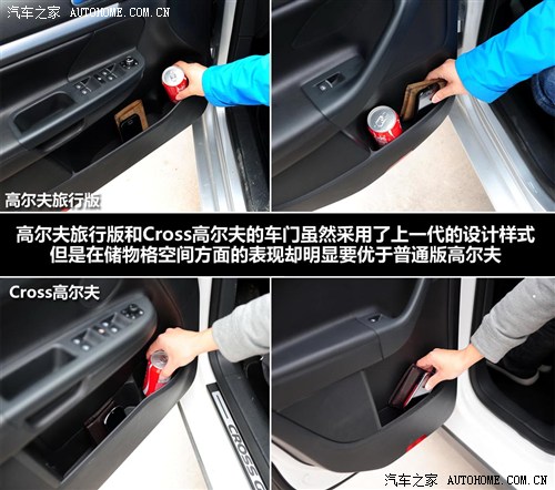 看过了乘坐空间,我们再来看看储物空间,由于高尔夫旅行版和Cross高尔夫的车门样式采用了上一代的设计,所以在车门的储物空间上面要优于现款的高尔夫,尤其是后门的储物空间最为明显。不过,储物格内部并没有采用普通版高尔夫的绒面材质,而是硬质塑料。储物格内的绒面处理,摸上去的质感要明显高于塑料材质,并且也避免了行驶中物品在储物格内磕碰周边所发出的声音。