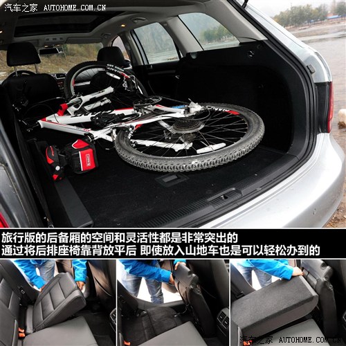 高尔夫旅行版在后备厢的空间上的优势毋庸置疑,不但空间大,高尔夫旅行版还可以将后排的坐垫翻起,靠背放倒后和后备厢地板形成一个平面,可以非常轻松的放置一辆山地车。