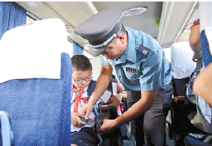 9月5日,杭州首批试点校车开始启用,孩子们在保安的指导下系上安全带。(记者 吴煌 李震宇 摄)