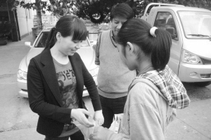 近日,在绍兴市和我市关工委的牵线及黄泽镇关工委有关同志的陪同下,爱心人士沈建红夫妇特地从百里之远的绍兴城区驱车前来镇中心小学六(4)班看望结对的贫困学生孙倩同学,给她带来了首次1000元扶贫金及许多生活与学习用品。图左为热心资助者沈建红,右为学生孙倩。