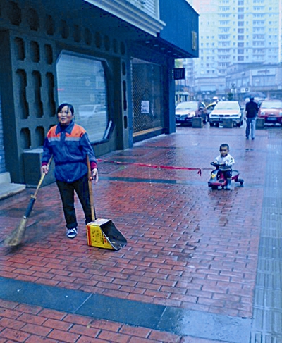 清洁工曾月英用绳子牵着儿子在清扫道路。金忠碧 摄