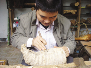 昨天,在离嵊州城区40公里的王院乡王院村百丈飞瀑景区,记者见到了钱继忠和他的根雕作坊。他告诉记者,在嵊州从事树根雕的有上千人,从事竹根雕的却只有他与师弟两人。“竹根雕产业应该很有前途的,只是目前有举步维艰的感觉。”他说。