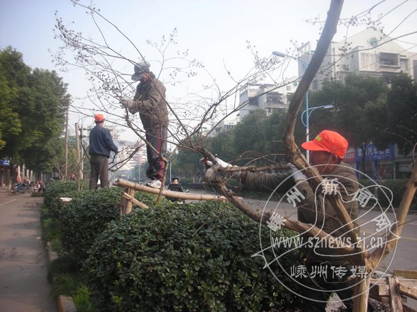 为进一步提高我市的绿化养护精细化管理水平,市园林管理处组织30多名养护人员对市区道路行道树、公园、绿地内树木进行了冬季定型、美容修剪,以确保树木正常生长。据园林管理处有关人员介绍,本月底前将基本完成市区所有树木的修剪工作。图为昨日上午,养护人员在官河路上给“蓬头乱发”的树木换新“发型”。