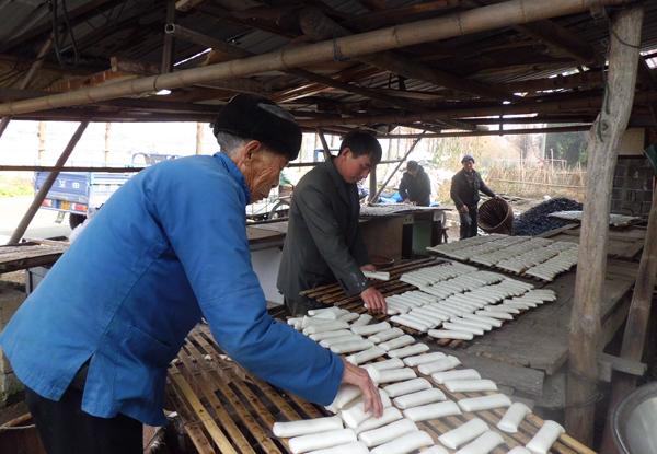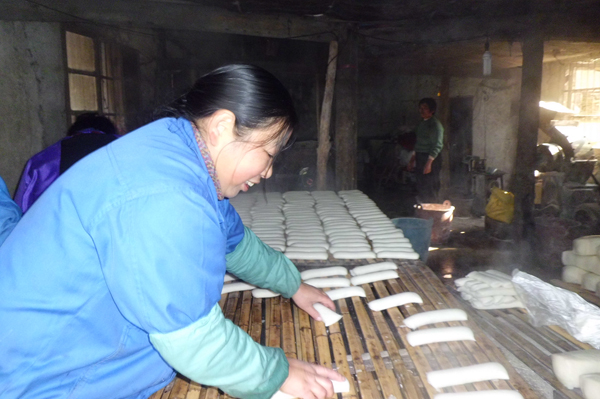 昨日,阴冷的天空飘起了小雨,让人感受到了寒冬的临近。可在三界镇蒋镇村的年糕加工作坊内却是热气腾腾,许多村民正忙着排列新鲜出炉的年糕。像蒋镇村这样做年糕的热闹场景在三界镇的各个村庄随处可见。据悉,三界镇是我市外出劳动力比较多的一个镇,临近冬至,家家户户都会做一些糯滑的年糕,快递给在外打工的亲人,有“年年高”的寓意,既是一个良好的祝愿,也是农家必备的年货。